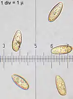 The spore print is olive to brownish olive. Under the microscope, the spores are elliptical to somewhat fusiform (spinde-shaped), measuring 11–15 μm long by 4.5–6.5 μm wide and have a median spore quotient of 2.2.[43][25] The basidia (spore-bearing cells) are club-shaped and four-spored, and measure 29.2–36.5 by 11.0–12.4 μm. Cystidia on the sides of the tubes (pleurocystidia) are fuse-shaped with swollen middles and long necks, measuring 33–48 by 7.3–13.5 μm; cheilocystidia (on the edges of the pores) have a similar morphology. The cap cuticle is made of cylindrical hyphae 3.7–5.8 μm wide that are interwoven compactly, and the hyphal tips are erect and arranged in bundles. In contrast, the hyphae of the cap flesh is loosely interwoven with hyphae that are cylindrical and branched, measuring 3.7–8.8 μm. Hyphae do not contain clamp connections.[46]