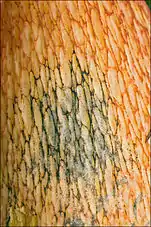 The carotenoid content of the fruit bodies differs substantially between the cap, the tubes, and the stem. The upper part of the cap, which contains 3.1 micrograms of carotenoid per gram (µg/g) fresh weight, has predominantly mutatochrome (47% of total carotenoids), 4-keto-α-carotene (40.2%), and δ-carotene (6.4%). The major carotenoids in the tubes (totaling 4.3 µg/g) include neurosporaxanthin (31.1%), auroxanthin (17.2%), 4-keto-α-carotene (17.1%), and rhodopin (15.8%). The stem (1.2 µg/g) contains primarily auroxanthin (32.5%), followed by 4-keto-α-carotene (19.9%), β-zeacarotene (18.5%), and rhodopin (11.4%).[88] The colour change observed with tissue injury is caused by variegatic and xerocomic acids, both of which turn blue when oxidized enzymatically upon exposure to air.[89]