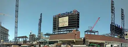 In 2014, Atlanta-based SunTrust Banks bought the initial naming rights to the stadium for 25 years.[60] In February 2019, SunTrust Banks announced a merger with BB&T to create what would become Truist Financial; Braves officials stated that the SunTrust Park name would remain in place during the 2019 season.[61] On January 8, 2020, crews began removing SunTrust Park signs from the stadium.[62] On January 14, 2020, the Braves and Truist Financial formally announced that the ballpark's name would change to Truist Park.[22][63]