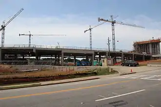 In November 2014, workers started drilling the holes for the pylons around the outside perimeter of the stadium's footprint.[45] According to the Braves vice president of business operations Mike Plant, phase one of construction for both the stadium and mixed-use development began in November 2014 and included infrastructure for the site, such as sewer, water and electrical systems.[44] The retention walls for the underground service level of the stadium were also built.[45] The underground level will have a few hundred parking spaces for players, team doctors, clubhouse staff and management staff.[45] By May 2015, crews had installed all the caissons to stabilize the foundation.[46] With the caissons complete, the crews began to pour concrete for the decks.[46]