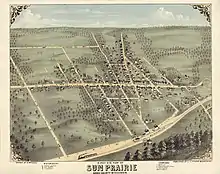 The Town of Sun Prairie was created on February 2, 1846.[11] The village of Sun Prairie, which grew from that town, was incorporated in an act of the Wisconsin legislature on March 6, 1868.[12]