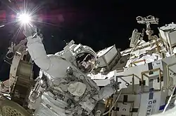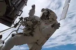 On the third spacewalk, Williams was outside the station for 6 hours and 40 minutes to complete three spacewalks in nine days. She has logged 29 hours and 17 minutes in four spacewalks, eclipsing the record held by Kathryn C. Thornton for most spacewalk time by a woman.[5][7] On December 18, 2007, during the fourth spacewalk of Expedition 16, Peggy Whitson surpassed Williams, with a cumulative EVA time of 32 hours, 36 minutes.[15][16] In early March 2007, she received a tube of wasabi in a Progress spacecraft resupply mission in response to her request for more spicy food. When she opened the tube, which was packaged at one atmospheric pressure, the gel-like paste was forced out in the lower pressure of the ISS. In the free-fall environment, the spicy geyser was difficult to contain.[17]