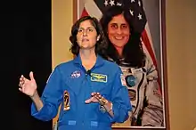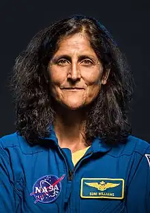 Sunita Lyn Williams (born September 19, 1965), nicknamed Suni in the United States and Sončka in Slovenia,[1] is an American astronaut, United States Navy officer, and former record holder for most spacewalks by a woman (seven) and most spacewalk time for a woman (50 hours, 40 minutes).[2][3][4][5][6][7] Williams was assigned to the International Space Station as a member of Expedition 14 and Expedition 15. In 2012, she served as a flight engineer on Expedition 32 and then commander of Expedition 33.