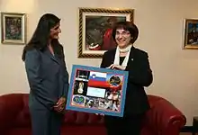 Williams has also visited Slovenia several times.[11] In 2009, the club Slovenian Astronaut (Slovenski astronavt) arranged a memorial room for her in Leše, Tržič, northwestern Slovenia.[42] Leše was the birthplace of her great-grandmother Marija Bohinjec, born in 1891, who immigrated into the United States as an 11-year-old in 1900 or 1901.[43] In May 2013, the former President of Slovenia Borut Pahor awarded Williams a medal of merit for her contribution to the popularisation of science and technology among the Slovenian youth.[44] During her stay in October 2014 she paid a visit to the Astronomical Society Vega in Ljubljana.[45][46] She visited Slovenia again in 2016.[47]