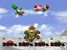 Like its predecessor, Super Smash Bros. Melee is a platform fighter that differs from traditional fighting games as the objective is to force their opponents beyond the boundaries of the stage.[2] Most attacks inflict damage and can, if enough damage is dealt, knock back the enemy. Each character's health is measured by a meter that represents damage as a percentage.[3] The higher the percentage value, the farther the player gets knocked back, and the easier they are to knock off the stage, which will result in the character's death and the loss of a stock, or life.[4] Unlike other games of the same genre, in which moves are entered by button-input combinations, most moves in Super Smash Bros. Melee can be accessed via one-button presses and a joystick direction.[5] For example, by tilting the joystick to the side and pressing the "B" button, the character will use their "side special" attack. Tilting the joystick up, down, or not tilting it at all while pressing B will use the up, down, or neutral special, respectively.