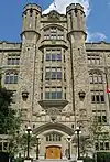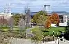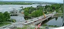 Widening to four lanes as it crosses the first of the ByTown Bridges over the Rideau River, Sussex Drive passes above Rideau Falls onto Green Island.[9] There the John G. Diefenbaker Building, former Ottawa City Hall, is complemented by the Ottawa Memorial, Mackenzie–Papineau Monument, the National Artillery Monument, and a statue of John McCrae.[10] Crossing the second bridge, the road returns to the mainland in the Lower Town neighbourhood and intersects the northern end of King Edward Avenue, which provides access to Quebec Autoroute 5 in Gatineau via the Macdonald-Cartier Bridge. Surrounding this intersection are the National Research of Canada (NRC) Laboratories as well as the Lester B. Pearson Building, which is home to Global Affairs Canada. The former residence of John A. Macdonald, Earnscliffe, is preserved at 140 Sussex Drive, adjacent to the NRC Labs.[1][6][11]