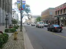 In 1959, following the passage of the National Capital Act the previous year, the National Capital Commission (NCC) was formed. The act replaced the FDC with the NCC and gave it broad ranging powers, including the ability to expropriate land.[64][65] One of the first issues that came before the NCC was the increasing commercialisation of Sussex Drive. In particular, the demolition of the 100 year old Goulden Hotel at the corner of Bruyere Street drew the ire of locals and set forth a movement to preserve the historic character of the road. Consequently, the NCC set forth in 1961 to purchase the remaining properties along Sussex Drive that were over 100 years old and establish a grand Mile of History.[66][67] Architect Peter Stoakes was tasked with uncovering historical records for each property and conducting studies into their current condition. While a number of a buildings were determined to be unfit and demolished, the remainder saw fire exits moved from the street, and facades sand-blasted, painted, and embellished to recreate an 1867 appearance.[68] However, the plan was never fully realised due to a number of a factors, including a shift in government with the election of Lester B. Pearson in 1963, as well as other more urgent priorities such as the Macdonald-Cartier Bridge approaches, Union Station, and Highway 417.[69] Despite this, the NCC purchased every historic property on the road by 1963.[70]