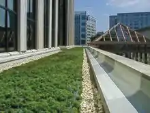 Plants growing on building - Zero-energy building to reduce energy consumption and greenhouse gas emissions using renewable energy sources.[15]