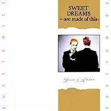 "Sweet Dreams (Are Made of This)" is a song by the British new wave music duo Eurythmics. It was released as the fourth and final single from their second album, Sweet Dreams (Are Made of This), in January 1983. It was their breakthrough hit, establishing the duo worldwide. It reached number two on the UK Singles Chart in March 1983, and number one on the US Billboard Hot 100 six months later; it was their first single released in the US.