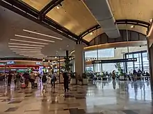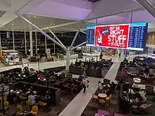 The terminal building is split into three levels, one each for arrivals, departures, and airline offices. The departure level has 20 rows of check-in desks each with 10 single desks making a total of 200 check-in desks. The terminal hosts eight airline lounges: two for Qantas, and one each for The House,[36] Air New Zealand, Singapore Airlines, Emirates, American Express, and SkyTeam. The terminal underwent a major $500 million redevelopment that was completed in 2010, by which the shopping complex was expanded, outbound customs operations were centralised and the floor space of the terminal increased to 254,000 square metres (2,730,000 sq ft).[37] Further renovations began in 2015 with a reconfiguration and decluttering of outbound and inbound duty-free areas, an extension of the airside dining areas, and the installation of Australian Border Force outbound immigration SmartGates. These works were completed in 2016.[38]