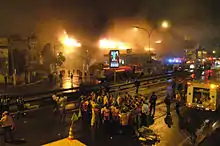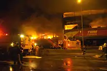 Flight 3054 was cleared to land at Congonhas's Runway 35L. Reviews by government officials of the surveillance videos showed that despite the aircraft touching down without incident, it did not slow down normally, veering to the left as it departed the far end at around 90 knots (170 km/h; 100 mph).[22] The runway is elevated above the surrounding area, and the aircraft's momentum carried it over traffic on the adjacent Avenida Washington Luís, a major thoroughfare, and crushed a four-story TAM Express facility, resulting in a large fire. The TAM Express facility contained offices and a warehouse, and was located adjacent to a Shell gas station. All 187 passengers and crew aboard died and the aircraft was destroyed.[23]