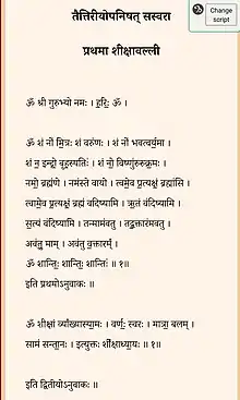 The Taittirīya Upanishad (Devanagari: तैत्तिरीय उपनिषद्) is a Vedic era Sanskrit text, embedded as three chapters (adhyāya) of the Yajurveda. It is a mukhya (primary, principal) Upanishad, and likely composed about 6th century BC.[1]