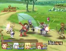 During battle sequences, the game uses the Multi-Line Linear Motion Battle System.[16][17] Four characters from the party are chosen to battle; those not controlled by a player are guided by artificial intelligence with instructions set by the player beforehand. Damage dealt to the opponent fills a "Unison Gauge". When this is full, a "Unison Attack" can be triggered, allowing the party to use techniques simultaneously on a single enemy. When certain techniques are combined, a special attack results in additional damage.[16]