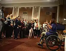 During the 115th Congress, Duckworth was credited with saving the Americans with Disabilities Act.[87] Specifically, she led public opposition to a controversial bill, H.R. 620,[88] and led 42 senators in pledging to oppose any effort to pass H.R. 620 through the Senate.[89] The Veterans Service Organization and Paralyzed Veterans of America recognized Duckworth's leadership in defending the Americans with Disabilities Act.[90]