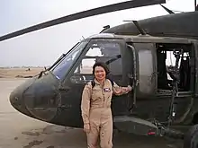 Following in the footsteps of her father, who served in World War II and the Vietnam War,[9] and ancestors who served in every major conflict since the Revolutionary War,[10] Duckworth joined the Army Reserve Officers' Training Corps[27] in 1990 as a graduate student at George Washington University.[28][29] She became a commissioned officer in the United States Army Reserve in 1992 and chose to fly helicopters[27] because it was one of the few combat jobs open to women at that time.[30] As a member of the Army Reserve, she went to flight school, later transferring to the Army National Guard and in 1996 entering the Illinois Army National Guard.[27] Duckworth also worked as a staff supervisor at Rotary International headquarters in Evanston, Illinois,[31][32] and was the coordinator of the Center for Nursing Research at Northern Illinois University.[33]