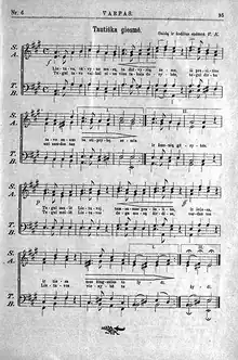 "Tautiška giesmė" (pronounced [ˈtɐʊtʲɪʃkɐ ɡʲɪɛsʲˈmʲeː]; literally "The National Hymn") is the national anthem of Lithuania, also known by its opening words, "Lietuva, Tėvyne mūsų"[1][lower-alpha 1] (official translation of the lyrics:[3] "Lithuania, Our Homeland", literally: "Lithuania, Our Fatherland"), and as "Lietuvos himnas"[4] ("The National Anthem of Lithuania"). The music and lyrics were written in 1898 by Vincas Kudirka, when Lithuania was still part of the Russian Empire. The fifty-word poem was a condensation of Kudirka's conceptions of the Lithuanian state, the Lithuanian people, and their past. Shortly before his death in 1899, the anthem was performed for Lithuanians living in Saint Petersburg, Russia.