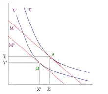 If we consider, for instance, two normal goods, x and y, whose prices are respectively px and py and an individual budget constraint given by the equation xpx + ypy = Y, where Y is the income, the slope of the budget constraint, in a graph where is represented good x on the vertical axis and good y on the horizontal axes, is equal to -py/px . The initial equilibrium is in the point (C), in which budget constraint and indifference curve are tangent, introducing an ad valorem tax on the y good (budget constraint: pxx + py(1 + τ)y = Y), the budget constraint's slope becomes equal to -py(1 + τ)/px. The new equilibrium is now in the tangent point (A) with a lower indifferent curve.