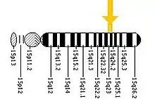 Tay–Sachs disease is caused by a genetic mutation in the HEXA gene on chromosome 15, which codes a subunit of the hexosaminidase enzyme known as hexosaminidase A.[1] It is inherited in an autosomal recessive manner.[1] The mutation disrupts the activity of the enzyme, which results in the build-up of the molecule GM2 ganglioside within cells, leading to toxicity.[1] Diagnosis may be supported by measuring the blood hexosaminidase A level or genetic testing.[2] Tay–Sachs disease is a type of GM2 gangliosidosis and sphingolipidosis.[5]