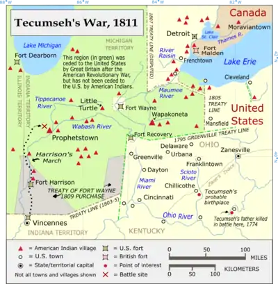 On November 6, 1811, Harrison's army arrived outside Prophetstown, and Tenskwatawa agreed to meet Harrison in a conference to be held the next day. Tenskwatawa, perhaps suspecting that Harrison intended to attack the village, decided to risk a pre-emptive strike, sending out about 500 of his warriors against the American encampment. Before the dawn of the next day, the Indians attacked, but Harrison's men held their ground, and the Indians withdrew from the village after the battle. Despite the surprise attack, the victorious Americans burned Prophetstown the following day and returned to Vincennes.[17] This ordeal is known as the Battle of Tippecanoe.
