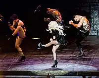 Gaga added "Telephone" to The Monster Ball Tour's setlist, for the 2010–2011 leg. She was dressed in black underwear and imitated a phone call with Beyoncé at the beginning of the performance, yelling "Beyoncé? You shady bitch!" to her cell phone.[122][123] She then started singing the track while doing its choreography on an extended catwalk from the main stage.[124] On March 3, 2010, she performed "Telephone" and "Brown Eyes" (from The Fame) on the British comedy chat show Friday Night with Jonathan Ross for an episode that aired two days later.[125] She sang "Telephone" on the Japanese television show Music Station on April 16, where she also played on a black keyboard.[126] In May 2011, Gaga performed the song during Radio 1's Big Weekend in Carlisle, Cumbria.[127] She sang it on her concert tours the Born This Way Ball (2012–2013)[128] and the ArtRave: The Artpop Ball tour (2014); during the latter it was part of a medley with "Poker Face".[129]