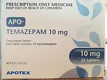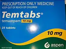 Temazepam (sold under the brand names Restoril among others) is a medication of the benzodiazepine class which is generally used to treat severe or debilitating insomnia.[8] It is taken by mouth.[8] Temazepam is rapidly absorbed, and significant hypnotic effects begin in less than 30 minutes and can last for up to eight hours.[9][7] Many studies, some going as far back as the early 1980s out of Australia and the United Kingdom, both of which have had serious temazepam abuse epidemics and related mortality, have all mostly corroborated each other and proven that the potential for abuse and physical dependence is very high, even in comparison to many other benzodiazepines. As a result, prescriptions for hypnotics such as temazepam have seen a dramatic decrease since 2010, while anxiolytics such as alprazolam (Xanax), clonazepam (Rivotril, Klonopin), and lorazepam (Ativan) have increased or remained stable.[10] Temazepam and similar hypnotics, such as triazolam (Halcion) are generally reserved for severe and debilitating insomnia. They have largely been replaced by z-drugs (zopiclone, zolpidem) and atypical antidepressants (trazodone, mirtazapine) as first line treatment for insomnia.[8]