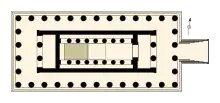 The temple was of peripteral form with a frontal pronaos (porch), mirrored by a similar arrangement at the back of the building, the opisthodomos. The building sat on a crepidoma (platform) of three unequal steps, the exterior columns were positioned in a six by thirteen arrangement, two rows of seven columns divided the cella (inner chamber) into three aisles. An echo of the temple's original appearance can be seen in the Second Temple of Hera at Paestum, which closely followed its form.