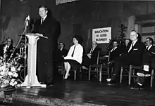 Sanford's cautious stance on civil rights and racial issues began to change while he traveled across North Carolina to visit schools to promote his education program.[133] Sanford visited both white and black schools and encouraged the students to pursue their education as means of securing economic prosperity in the future. Over time he grew uncomfortable saying this to black schoolchildren, later explaining, "I had the sickening feeling that every time I talked to them I was saying words that were a mockery ... I was talking about opportunities that I knew, and I feared they knew, didn't exist, no matter how hard they might work in school."[134] Sanford was also moved to reconsider his views after discovering that many elderly blacks in Raleigh were—to his surprise—dissatisfied with the status quo and financially supporting student protestors.[135]