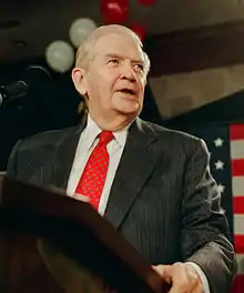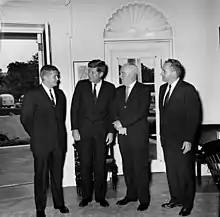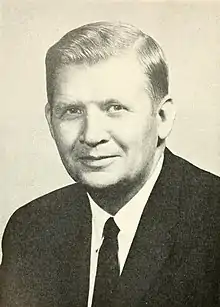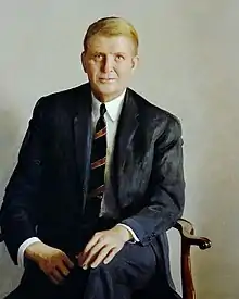 Sanford faced a strong opponent for the governor's race, Robert L. Gavin, a moderate conservative Republican attorney. Gavin denounced Sanford as a tool of the liberal leadership of the national Democratic Party and organized labor.[77] Although his reputation had been harmed by his early endorsement of Kennedy, Sanford enthusiastically campaigned for the two of them.[78] He attacked Gavin for contradicting himself on several occasions and for displaying a lack of familiarity with certain issues.[79] In the November election both Kennedy and Sanford won the offices they sought. Kennedy won the popular vote in North Carolina. Sanford won with 54.3 percent of the vote, approximately 131,000 votes over Gavin, but his performance was lackluster for a Democrat seeking state office at the time.[77] Sanford remained proud of his gubernatorial victory for the rest of his life, feeling he had defeated a racist candidate (Lake) and avenged Graham's loss in 1950.[80] Out of appreciation for Sanford's contribution to his campaign, Kennedy appointed Hodges to his cabinet as United States Secretary of Commerce.[81] Sanford arranged for Bennett to assume the chairmanship of the North Carolina Democratic Party.[82] In that capacity, Bennett organized continued backing for Sanford within the party and eased the way for many of Sanford's supporters to advance in its ranks.[83]
