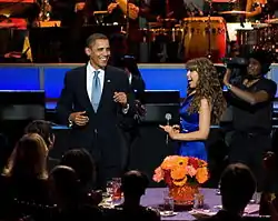 On 30 July 2009, Thalía recorded her acoustic album, Primera fila, her first album after she signed with Sony Music Entertainment.[61][62] In October, Thalía performed at the White House, along with other Latin singers, in an event organized by President Barack Obama that celebrated Hispanic heritage. Thalía's performance was iconic and historic, as she was the first celebrity to publicly invite a United States President to dance.[63]