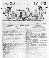 Collodi wrote a number of didactic children's stories for the recently unified Italy, including Viaggio per l'Italia di Giannettino ("Little Johnny's voyage through Italy"; 1876), a series about an unruly boy who undergoes humiliating experiences while traveling the country, and Minuzzolo (1878).[8] In 1881, he sent a short episode in the life of a wooden puppet to a friend who edited a newspaper in Rome, wondering whether the editor would be interested in publishing this "bit of foolishness" in his children's section. The editor did, and the children loved it.[9]