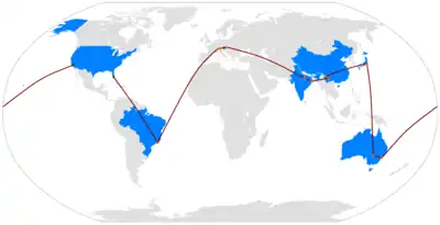 Prior to each of the Races, the production team plans out the locations and tasks that the racers will travel, working in conjunction with local representatives, each of whom Van Munster had initially had available for a different show.[5] The staff also consults with ex-military or federal agents that are aware of political matters in foreign areas, who may advise on countries or regions to avoid.[13] Van Munster and others will then travel the proposed course to verify the locations and identify needs for filming for the show.[5] The crew works with local government representatives to assure the safety of the racers while traveling through certain areas of the world.[11] Despite pre-planning, the production crew may be faced with obstacles forcing them to change tasks or even locations. In one situation during planning of the second race, the Argentine bank system failed, creating political unrest, and a new country was selected.[5][13] Similarly, after the Egyptian Revolution of 2011 and the sexual assault of South African-American reporter Lara Logan who worked for CBS, the production staff considers Egypt to be "off the map right now."[13] While filming had started on the 33rd season of the race in early February 2020, CBS temporarily stopped production and ordered all teams and staff back to the United States due to the COVID-19 pandemic out of caution, though stated that the virus had not been contracted by anyone on the show. At the time, three episodes of the season had been filmed and no new production start date for the series had yet been determined.[14] In 2023, van Munster said that they would not be traveling to Russia, China, and certain parts of West Africa for the foreseeable future.[15] It has been estimated, by Van Munster, that over 2,000 people worldwide are involved in the production of any one season of the Race.[5]