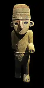 Hergé's Arumbaya fetish was based on the design of a genuine Peruvian statue in Brussels' Royal Museums of Art and History; a pre-Columbian Chimu statue, it was made of wood and dated to between 1200 and 1438 CE.[18] Whereas Hergé had access to speakers of Mandarin when creating The Blue Lotus, he had no access to speakers of indigenous Amerindian languages, and as such, the Arumbaya language that he developed was entirely fictitious.[19] He based its structure largely on the Brusseleir dialect spoken in the Marolles area of Brussels, mixed with Spanish endings and constructions.[13] In developing the Arumbaya's rivals, the Bibaros, he was influenced by anthropological accounts of head shrinking among the Jibaros tribes; when Leslie Lonsdale-Cooper and Michael Turner translated the book into English, they renamed the Bibaros as the Rumbabas, a pun on the rum baba pudding.[13] The explorer Ridgewell, found living among the Arumbayas is based upon the British explorer Colonel Percy Harrison Fawcett, who mysteriously disappeared into the Amazon jungle in 1925. In crafting the story, Hergé was possibly influenced by The Maltese Falcon, as there are similarities in their plots.[20]