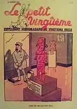 Georges Remi—best known under the pen name Hergé—was employed as editor and illustrator of Le Petit Vingtième ("The Little Twentieth"),[7] a children's supplement to Le Vingtième Siècle ("The Twentieth Century"), a staunchly Roman Catholic, conservative Belgian newspaper based in Hergé's native Brussels which was run by the Abbé Norbert Wallez. In 1929, Hergé began The Adventures of Tintin comic strip for Le Petit Vingtième, revolving around the exploits of fictional Belgian reporter Tintin. Wallez ordered Hergé to set his first adventure in the Soviet Union as anti-socialist propaganda for children (Tintin in the Land of the Soviets),[8] to set his second adventure in the Belgian Congo to encourage colonial sentiment (Tintin in the Congo),[9] and to set his third adventure in the United States to use the story as a denunciation of American capitalism (Tintin in America).[10] Wallez was subsequently removed from the paper's editorship following a scandal, although Hergé was convinced to stay on the condition of a salary increase.[11] In preparing The Broken Ear, Hergé developed the new habit of keeping plot notes and ideas in a notebook.[12] He also began making cuttings of photographs and other images from magazines and newspapers, filing them away for future use; he used them as a basis for many of the drawings in The Broken Ear.[13]