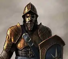 The filmmakers interpreted the Telmarines, including Caspian, as being Spanish because of their pirate origins, which producer Mark Johnson noted made Caspian "a contrast to the lily-white [Pevensies]".[64] Production designer Roger Ford originally wanted the Telmarines to be French, as they had a confrontational history with the English, who are represented by the Pevensies. This was scrapped as the crew were unable to shoot at Pierrefonds Castle, for Miraz's lair, so they went for the Spanish feel.[65] Weta Workshop created masked helmets for their army, and faceplates for the live horses on set. The stunt soldiers wield two hundred polearms in two different styles, two hundred rapiers of varying design, over a hundred falchions, two hundred and fifty shields and fifty-five crossbows. Caspian's own sword is a variation of the Royal Guard's weapons.[63] Costume designer Isis Mussenden looked to the paintings of El Greco to inspire the Telmarines' costumes.[55] She wanted to use colours that looked "acidic and hot and cool at the same time", unlike the red and gold seen in the Narnian soldiers.[34] Their masked helmets are based on conquistadors and samurai.[66] She visited the armour archives of the Metropolitan Museum of Art for inspiration.[39] An eagle emblem was incorporated into the characters' lairs to make them feel fascist.[67]