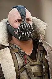 Costume designer Lindy Hemming explained that Bane uses a mask to inhale an analgesic gas, which, in director Christopher Nolan's words, "keeps his pain just below the threshold so he can function." In designing Bane's costume, Hemming needed it to look "like an amalgam of all sorts of bits and pieces he cobbled together, as he passed through some very remote places. We made parts of his vest, for example, from fragments of an old military tent. His clothes are militaristic, but are not in any way a uniform." Hemming also designed Bane's mask to look "animalistic".[8][116][117] Costume effects supervisor Graham Churchyard created a three-dimensional model of actor Tom Hardy's face and skull to design the mask, allowing the mask to perfectly conform to the contours of Hardy's face.[8] Hemming personally designed Bane's coat, which took two years to complete. Taking inspiration from a Swedish army jacket and a frock coat from the French Revolution, it was designed to make Bane look equal parts dictatorial and revolutionary.[8] The design was difficult as Hemming struggled to find a tailor in Los Angeles who could work with shearling.[118]