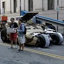 Production photos from filming in Pittsburgh showed a second Tumbler chassis after the first was destroyed, indicating that a new Batmobile would be in the film, following the destruction of the first in The Dark Knight.[107] Further set photos revealed a "new vehicle" being transported to Wabash Tunnel, prompting speculation as to its nature.[108] In June 2011, Autoblog confirmed the presence of the new Lamborghini Aventador on the film set.[109]