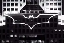 The film introduces a vehicle that has been compared with the Batplane and the Batcopter, dubbed "the Bat". In designing the Bat, Nathan Crowley approached it as if it were an actual military project, emphasising the need for it to "fit into the same family" as the Tumbler and the Batpod. The final version of the Bat takes its design cues from the Harrier jump jet, Bell Boeing V-22 Osprey and the Boeing AH-64 Apache.[8] Chris Corbould described the Bat's size and shape as presenting a major challenge for filming given Christopher Nolan's emphasis on practical effects over computer-generated imagery. In order to make the Bat "fly", it was variously supported by wires, suspended from cranes and helicopters, and mounted on a purpose-built vehicle with hydraulic controls to simulate movement.[8][120][121]