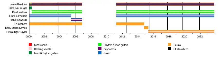 ![]() Left to right: Dan and Justin Hawkins and Frankie Poullain (obscured: Ed Graham), performing at Terminal 5 in 2012 | |
