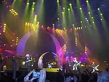 The success of the album led to heavy touring for the band over the next two years, including European portions of Metallica's Summer Sanitarium Tour 2003.[14][15] The band would later be added to the 2004 Big Day Out festival tour, performing alongside Metallica, Muse, The Strokes, Lostprophets, The Mars Volta, and The Black Eyed Peas.[16] They then went on to headline the Carling Festival in 2004. The band won three BRIT Awards in 2004 in response to the album, Best Group, Best Rock Group and Best Album. They also won two Kerrang! awards in 2004 for Best Live Act and Best British Band. The third single from the album, "I Believe in a Thing Called Love", was a smash hit in the UK and the United states, becoming the second highest charting single of 2003 released by a UK band in America. The band also managed a Christmas 2003 number 1, "Christmas Time (Don't Let the Bells End)", which only just fell short, both singles reaching number 2 in 2003.[17][18]
