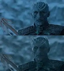 In order to create the Night King, according to Barrie Gower, it is primarily practical prosthetic, but also incorporates some VFX to create a more icy look and feel, saying about the eyes, "The effects department alters the eyes in post-production. They give them that blue-glowy hue to them, which we can't really achieve with contact lenses." In regards to the overall prosthetic, "they've added this sort of icy layer over the top of him to create this — it's something incredibly difficult to achieve practically, prosthetics are cast in a translucent rubber, which can only give you so much of that icy quality, so visual effects help augment it a little bit further to give it more dimension." Prior to the sixth season, the Night King was portrayed by Richard Brake, with a head mold of Brake being created in order to accurately mold the prosthetic to his face.[15] In the sixth season he was portrayed by Vladimir Furdik.[16] The White Walker army was first shot in front of a green screen in Magheramorne quarry, and according to a piece in The Hollywood Reporter "A scan was taken from a drone and used as the basis for a CG model of the location, which was augmented with VFX and joined with volcanic hills that were photographed in Iceland."[13] Crowd replication was used to create the 1,000-man army, with special effects supervisor Joe Bauer saying "It's scans of those actors in the makeup and costumes, with variations we used to make a digital army that extends up onto the hills."[13] Bauer also noted that VFX were used to create the weather conditions in the scene, noting "It's wind, mist, fog and heavy atmosphere that you'd get in a marine layer. The dramatic value is to say something's wrong; it's a mystery what they are facing. The temperature drops, and our characters can see their breath. The weather obscures their vision."[13] Spain-based El Ranchito, one of several special effects companies used by Game of Thrones, was responsible for the White Walker army shots.[13]