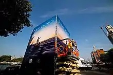 Pink Floyd and Parlophone unveiled The Endless River on 22 September 2014, including the release date, artwork and track listing, accompanied by a promotional website, a hyperstitial for the Pink Floyd website.[39] The site featured an artist's statement, photographs from the Division Bell sessions, pre-order details and two teasers, one featuring a 30-second snippet of "It's What We Do", and a television advertisement, featuring the album's geometric-based artwork.[40][41] Pre-orders on physical and digital formats started the same day.[42][43] Prominent installations of the album's artwork were placed around the world, including a four-sided 8m tall billboard placed in South Bank, London,[25][44] and large-scale poster advertisements in cities such as Berlin, Paris, Los Angeles, Milan, New York and Sydney.[45][46]