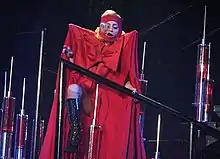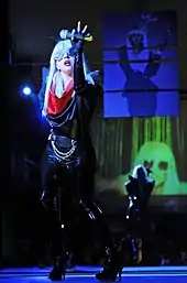 To promote the album, Gaga did several performances worldwide. Her first televised appearance was on Logo's NewNowNext Awards on June 7, 2008.[45] She also performed on Michalsky StyleNite at Berlin Fashion Week, So You Think You Can Dance,[46] Jimmy Kimmel Live!,[47] The Tonight Show with Jay Leno,[48] as well as in Vietnam for the 57th Miss Universe beauty pageant during the swimsuit competition.[49] On January 31, 2009, she performed on television in Ireland on RTÉ One's show Tubridy Tonight.[50] Three songs from The Fame were used in the second season of The CW's series Gossip Girl: "Paparazzi" in the episode "Summer, Kind of Wonderful",[51] "Poker Face" in "The Serena Also Rises",[52] and "Money Honey" in "Remains of the J".[53] Gaga also performed "Poker Face" on American Idol on April 1, 2009.[54] At the 2009 MTV Video Music Awards, the singer performed "Paparazzi". Her gig involved choreographed dance moves, playing on the piano, theatrical blood dripping from her ribcage, and ended with the singer hung lifeless with one hand rising above her dancers and blood smeared on her face.[55] It is widely considered to be one of Gaga's greatest performances to date,[56] and according to Billboard's Ashley Laderer, "this was the performance that really made Lady Gaga. It proved she was more than just a superficial pop star—she was an artist".[57]