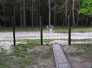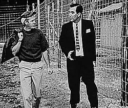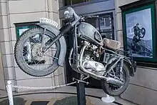 The motorcycle chase scenes with the barbed wire fences were shot on meadows outside Füssen, and the "barbed wire" that Hilts crashes into before being recaptured was simulated by strips of rubber tied around barbless wire, constructed by the cast and crew in their spare time.[31] Insurance concerns prevented McQueen from performing the film's notable motorcycle leap, which was done by his friend and fellow cycle enthusiast Bud Ekins, who resembled McQueen from a distance.[32] When Johnny Carson later tried to congratulate McQueen for the jump during a broadcast of The Tonight Show, McQueen said, "It wasn't me. That was Bud Ekins." However, McQueen and Australian Motocross champion Tim Gibbes both performed the stunt on camera for fun, and according to second unit director Robert Relyea, the stunt in the final cut of the movie could have been performed by any of the three men.[33] Other parts of the chase were done by McQueen, playing both Hilts and the soldiers chasing him, because of his skill on a motorcycle.[34] The motorcycle was a Triumph TR6 Trophy which was painted to look like a German machine. The restored machine is currently on display at Triumph's factory at Hinckley, England.[35]