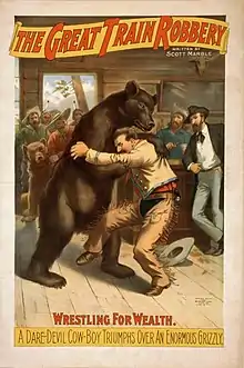 Porter (and possibly Anderson) drew on various sources when planning the scenario for The Great Train Robbery.[11] Western themes were already popular in films and other entertainment, reflecting the wide public interest in stories about the past and present of the American West. Many American films before 1900 can be classified as Westerns,[12] such as actuality views of cowboy life, staged Western anecdotes like A Bluff from a Tenderfoot and Cripple Creek Bar-Room Scene (both 1899), and shots of Annie Oakley and of Oglala and Brulé dancers from Buffalo Bill's Wild West Show (both 1894).[13] Studios abroad also began telling Western stories early on, with Mitchell and Kenyon's 1899 British film Kidnapping by Indians the first known example.[14] Edison's 1901 film Stage Coach Hold-up, based on Buffalo Bill's "Hold-up of the Deadwood Stage" act, probably influenced Porter directly.[11] Porter may have also been inspired by recent real events related to the American West: in August 1900, Butch Cassidy and his gang had robbed a Union Pacific Railroad train and escaped capture,[15] and in September 1903, Bill Miner's gang made an unsuccessful holdup of an Oregon Railroad and Navigation Company train.[16]