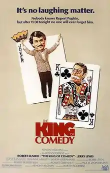 The King of Comedy is a 1982[3] American satirical black comedy film directed by Martin Scorsese and starring Robert De Niro (in his fifth collaboration with Scorsese), Jerry Lewis and Sandra Bernhard.[4] Written by Paul D. Zimmerman, the film focuses on themes such as celebrity worship and American media culture. 20th Century Fox released the film on February 18, 1983, in the United States,[5] though the film was released two months earlier in Iceland.[6]