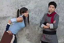 According to critic Mike Hoffman, the romantic interests of Korra and her companions are less in the foreground than in Avatar, and feature mainly in the first two seasons.[17] In Book One, Bolin pines for Korra, who is interested in Mako, who dates Asami. By the end of the season, Mako has broken up with Asami and entered a relationship with Korra. This ends around the end of Book Two, during which Bolin suffers from an abusive relationship with the waterbender Eska. In the fourth season, Bolin dates the airbender Opal, while Asami and Korra become closer friends. The series' final scene indicates a romantic connection between them.[18] Mike DiMartino wrote that the scene "symbolizes their evolution from being friends to being a couple".[19] They both are in a relationship in comics.