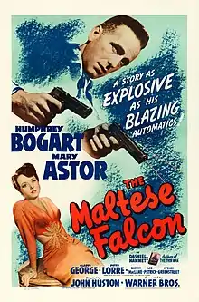 The Maltese Falcon is a 1941 American film noir written and directed by John Huston[3] in his directorial debut, based on the 1930 novel of the same name by Dashiell Hammett and indebted to the 1931 movie of the same name.[4][5][6] It stars Humphrey Bogart as private investigator Sam Spade and Mary Astor as his femme fatale client. Gladys George, Peter Lorre and Sydney Greenstreet co-star, with the last appearing in his film debut. The story follows a San Francisco private detective and his dealings with three unscrupulous adventurers, all of whom are competing to obtain a jewel-encrusted falcon statuette.[3]