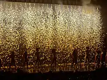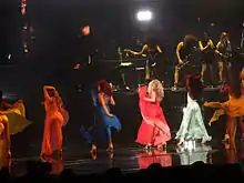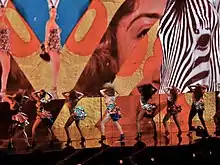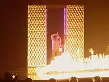 One of Beyoncé's costumes which was worn during the first concerts was a gold bodysuit designed by The Blonds embellished with golden breasts complete with a nipple detail.[42] The costume was a collaboration between the group, Beyoncé, Knowles, and Hunter. It was hand embroidered in 600 hours with approximately 30,000 Swarovski crystals.[43] According to The Blonds, it was meant to give the illusion of being covered in crystallized honey and reflect Beyoncé's personality for the tour.[43] They were inspired by Beyoncé's songs of female empowerment[42] and female nudes painted by Tamara de Lempicka.[44] The costume received wide media and fan attention and divided critics' opinions.[45][46][47] InStyle's Meghan Blalock described the costume as the "most scandalous" that the singer has worn in her career.[44] For the 2014 shows, the singer wore numerous new designs collaborating again with DSQUARED2, Givenchy, Pucci and Weitzman as well as with new designers such as Tom Ford, Versace and Karen Langley.[48]