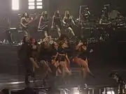Eight hundred dancers auditioned to be included in Beyoncé's performance at the Super Bowl XLVII halftime show and a selected group of them, consisting only of females, were chosen for the performance as well as for the tour.[19] French dancing duo Les Twins also accompanied Beyoncé on stage performing street dances. Three backing singers The Mamas, and an eleven-piece female band who had also supported the singer during her previous tours performed during the concerts.[20][21] Two stages were used during the performances: a main stage where the singer performed throughout most of the concert and a B-stage closer to the audience where she was transferred with a rope, flying over the crowd midway through the set, performing three songs there.[19][22] The set list of the 2013 portion of the tour included approximately twenty five songs from Beyoncé's four solo studio albums: Dangerously in Love (2003), B'Day (2006), I Am... Sasha Fierce (2008), and 4 (2011). The majority of the songs originated from 4 – seven songs were performed from that album.[23] Many of the tracks performed contained different choreographies and arrangements compared to the previous performances by the singer; several of them were intertwined with other artists' material.[24] For the 2014 shows many of the previously performed songs were removed and eight new songs from Beyoncé's fifth self-titled studio album were added to the concert's set list.[25]