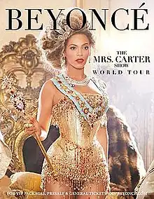 During a press conference for Super Bowl XLVII on January 31, 2013, Beyoncé revealed that she would make an announcement after her performance at the halftime show and added that "fans should just stay tuned to see".[2] Beyoncé announced the tour and its name after her performance the Super Bowl XLVII halftime show on February 3. The tour's title refers to her marriage with Shawn 'Jay-Z' Carter. However, the official poster of the tour with the name written on it was leaked on the ticket's website Live Nation prior to the official announcement.[3] It shows Beyoncé wearing a Victorian golden royal top and a crown, referencing Queen Elizabeth I.[4] Rosie Swash of The Guardian described it as a "visual stamp of authority".[5] Along with the tour's name, initial dates in Europe and North America were announced, and later more were added in Latin America, Australia, and New Zealand.[6]